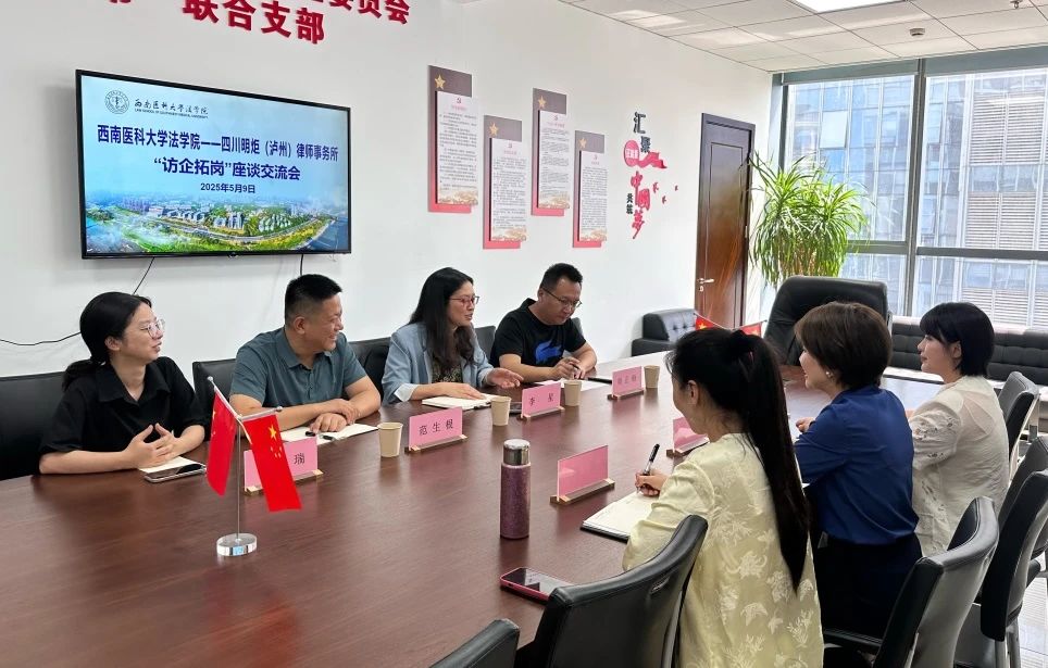 2025年5月9日下午,為深入落實“訪企拓崗”促就業專項行動部署,進一步拓寬學生就業渠道,西南醫科大學法學院黨委書記李星、黨委副書記范生根等一行來我所開展“訪企拓崗”專項行動。我所主任楊霞、行政總監田甜、王梨均律師參加座談交流。
